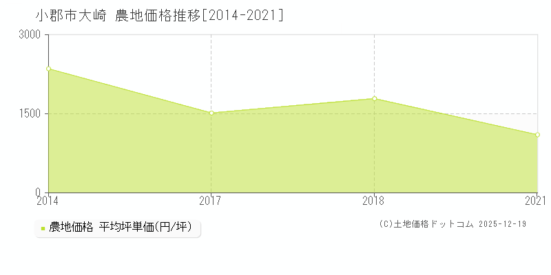 大崎(小郡市)-福岡県農地価格[坪単価 2021年]資料|2021年に国土交通省が実施している取引価格情報提供制度にかかる公表資料データ、大崎(小郡市)の農地取引事例[2014-2021年]を4件収録。町域(地点)の農地価格(平均坪単価・変動率)一覧・農地価格の推移グラフなどの相場情報を以下に掲載。