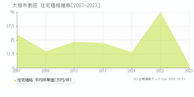 割田(大垣市)-岐阜県住宅価格[坪単価 2023年]資料|2023年に国土交通省が実施している取引価格情報提供制度にかかる公表資料データ、割田(大垣市)の住宅取引事例[2007-2023年]を10件収録。町域(地点)の住宅価格(平均坪単価・変動率)一覧・住宅価格の推移グラフなどの相場情報を以下に掲載。