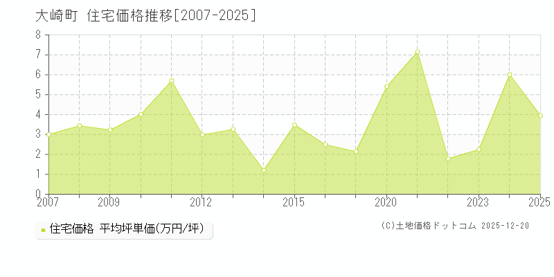 大崎町-鹿児島県住宅価格[坪単価 2025年]資料|2025年に国土交通省が実施している取引価格情報提供制度にかかる公表資料データ、大崎町(鹿児島県)の住宅取引事例[2007-2025年]を61件件収録。町域(9地点)の住宅価格(平均坪単価・変動率)一覧・住宅価格の推移グラフなどの相場情報を以下に掲載。