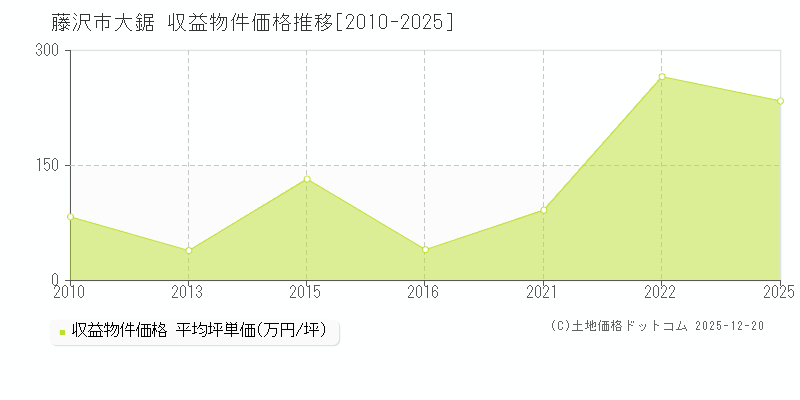 大鋸(藤沢市)-神奈川県収益物件価格[坪単価 2025年]資料|2025年に国土交通省が実施している取引価格情報提供制度にかかる公表資料データ、大鋸(藤沢市)の収益物件取引事例[2010-2025年]を11件収録。町域(地点)の収益物件価格(平均坪単価・変動率)一覧・収益物件価格の推移グラフなどの相場情報を以下に掲載。
