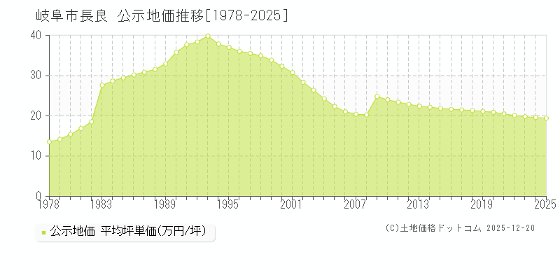 長良(岐阜市)-岐阜県公示地価[坪単価 2025年]資料|2025年に国土交通省が実施している地価公示にかかる公表資料データ、長良(岐阜市)の地価公示[1978-2025年]を3件収録。町域(地点)の公示地価(平均坪単価・変動率)一覧・公示地価の推移グラフなどの相場情報を以下に掲載。