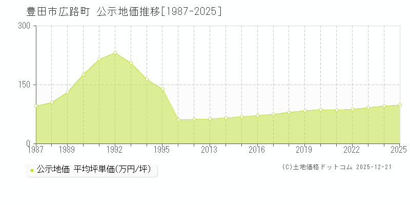 広路町(豊田市)-愛知県公示地価[坪単価 2025年]資料|2025年に国土交通省が実施している地価公示にかかる公表資料データ、広路町(豊田市)の地価公示[1987-2025年]を1件収録。町域(地点)の公示地価(平均坪単価・変動率)一覧・公示地価の推移グラフなどの相場情報を以下に掲載。