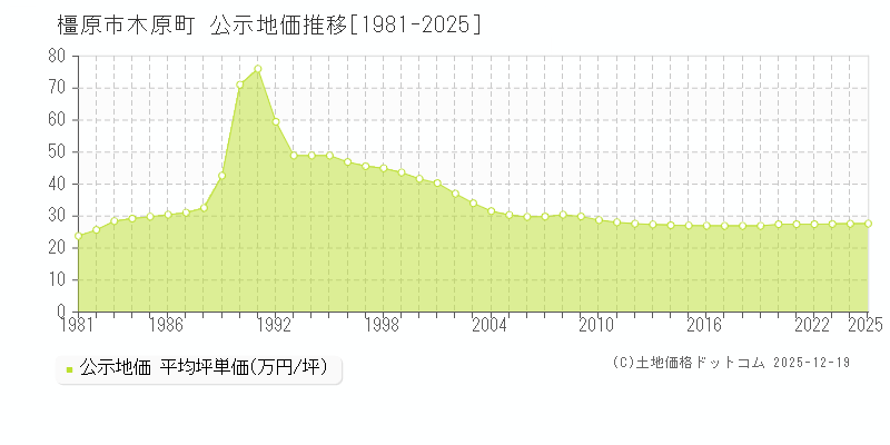木原町(橿原市)-奈良県公示地価[坪単価 2025年]資料|2025年に国土交通省が実施している地価公示にかかる公表資料データ、木原町(橿原市)の地価公示[1981-2025年]を1件収録。町域(地点)の公示地価(平均坪単価・変動率)一覧・公示地価の推移グラフなどの相場情報を以下に掲載。